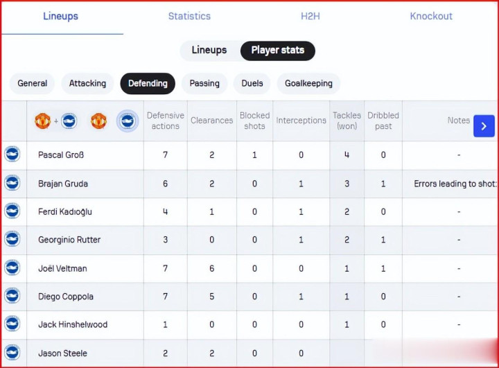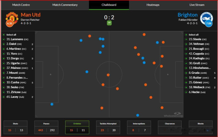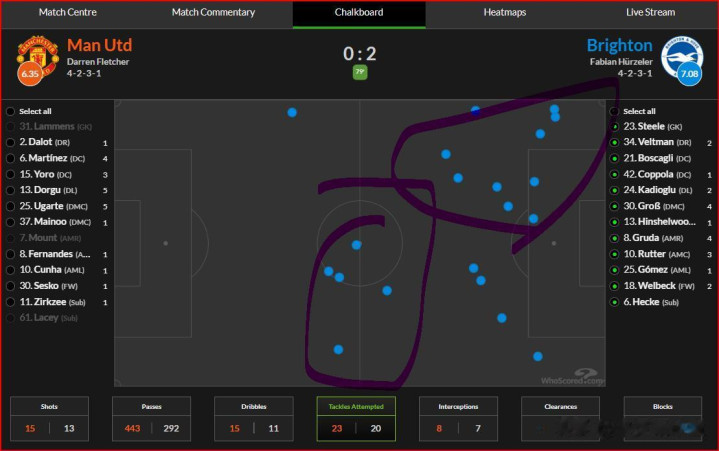 你再看一下布莱顿完成中场球员抄截 的球员,几乎都是中场球员球员靠前,这场赛事 曼联的中场球员完全被对手所压制,你无法完成有效的向前出球,你无法阻止有效的攻击 ,你基本上只能依靠球员的个人能力来组织攻击 。