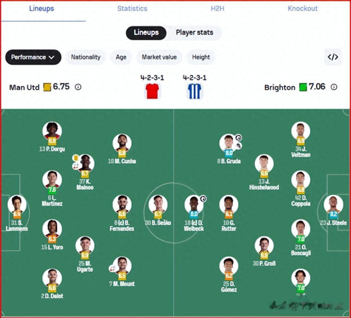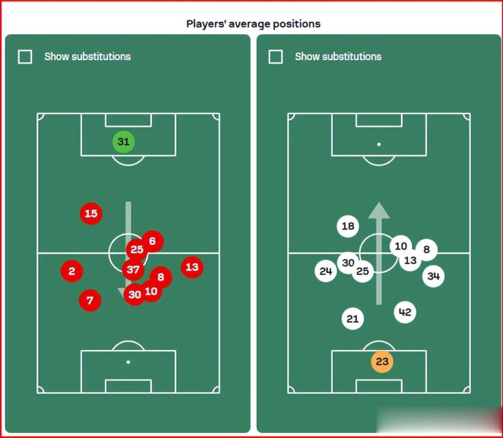 赛前的杆位阵形 出来的时候,就感觉有点不对劲,因为这有点像弗莱彻在U18执教时期的策略 体系,那就是走地面攻击 、攻击 宽度完全依赖于边后场球员,好了,这场赛事 果然是这么踢。塞斯科杆位担任锋线箭头、芒特+B费+库尼亚搭档前腰,梅努+乌加特搭档中场球员,曼联实际上拿出了5中场球员的配置。