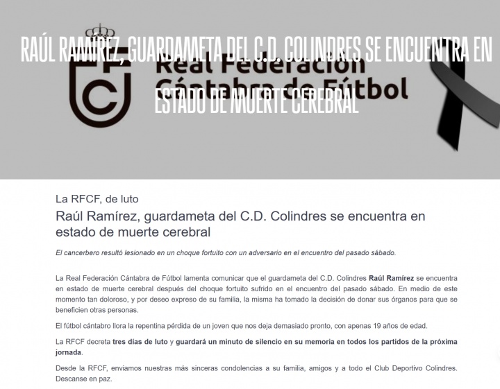 坎塔布里亚皇家古代足球 协会遗憾地宣布,C.D.科林德雷斯的守门员劳尔-拉米雷斯在上周六赛事 中遭受意外追尾后,被确诊为脑死亡。在这一极为痛苦的时刻,根据其家人的明确意愿,他们决定捐献他的器官,以造福他人。