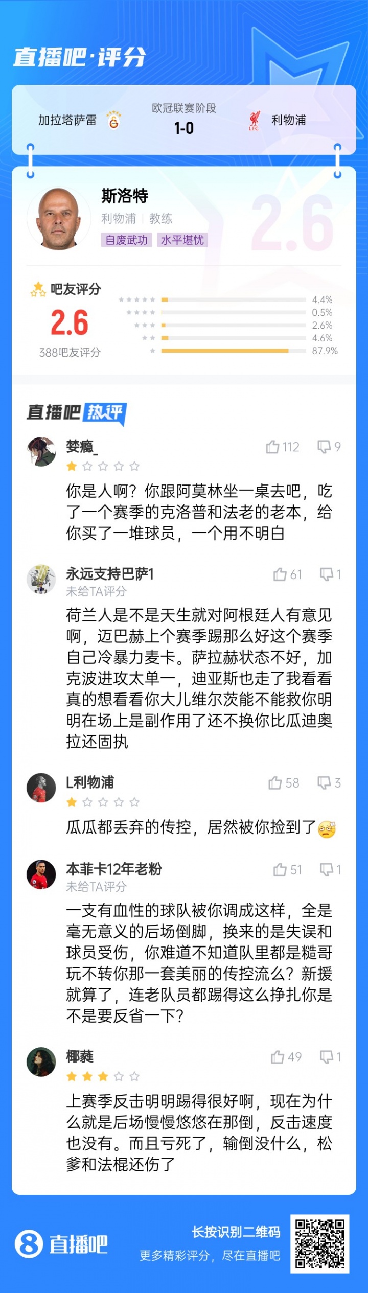 本场赛事 ,吧友们给斯洛特打出了2.6分的超低分。