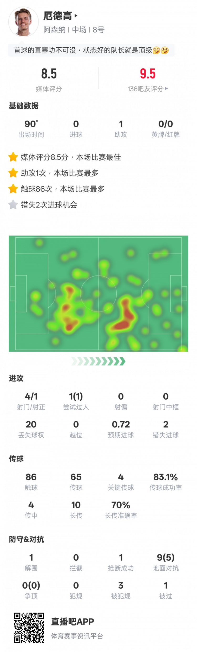 此役厄德高为阿森纳踢满全场,送出1记助功 ,苏超在线直播高清视频无插件阿森纳官方宣布,经过球迷的投票,厄德高当选本场赛事 队内最佳球员。