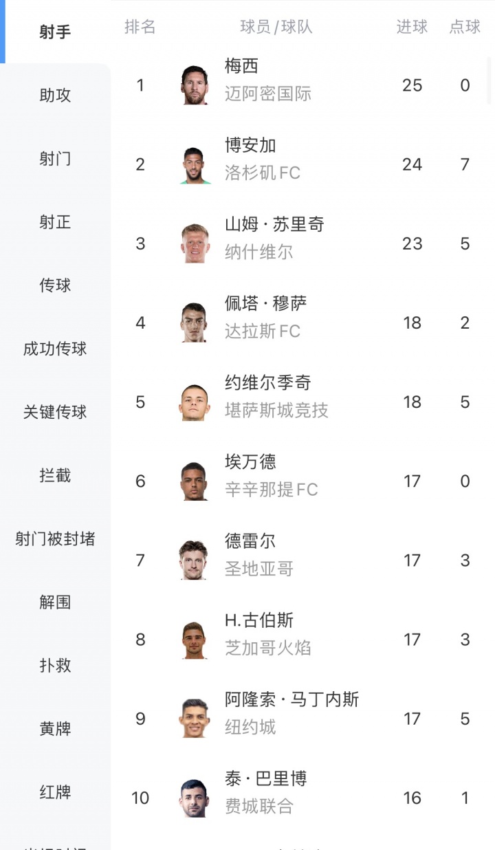 > 38岁冲金靴!梅西位列MLS射手榜第一,25球0点