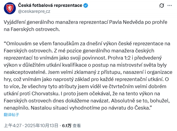 此役失败 后,捷克国家队官推发布了捷克国家队总经理内德维德的致歉声明。