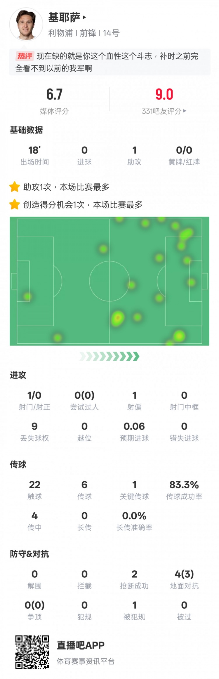 10月20日讯 2025-26赛季英超第8轮焦点战,利物浦主场作战 1-2曼联。小基耶萨后备 登场,送出1次助功 ,苏超直播1次关键传送球 ,还有2次抄截 ,评分6.7。