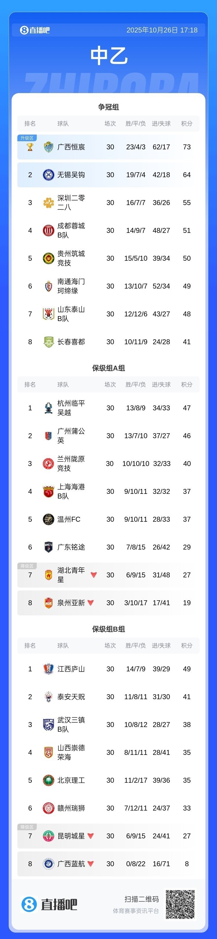 10月26日讯 2025赛季中乙职业联赛 今日收官,苏超直播在线观看提前夺魁 的广西恒宸1-2不敌无锡吴钩、成都蓉城B队4-2击败长春喜都。
