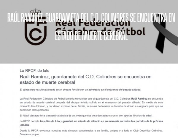 体育直播平台推荐 09月29日讯 西协甲球队科林德雷斯队守门员劳尔-拉米雷斯因在上周六的赛事 中头部受到撞击,于今晨不幸去世。 据世界体育报报道,这位来自坎塔布 ...