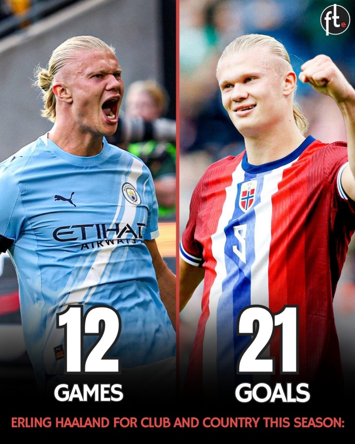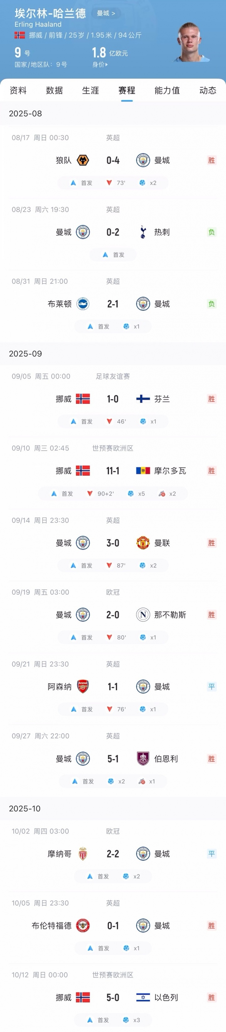 10月12日讯 本轮世预赛挪威5-0横扫以色列,哈兰德上演独中三元,将个人本赛季的得分 数提高到21粒。